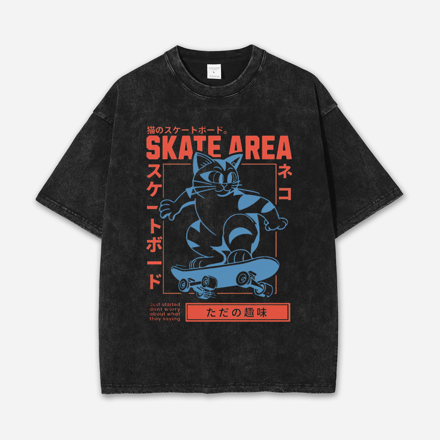 Vintage Japanese Cat Art Graphic Acid Washed T Shirt