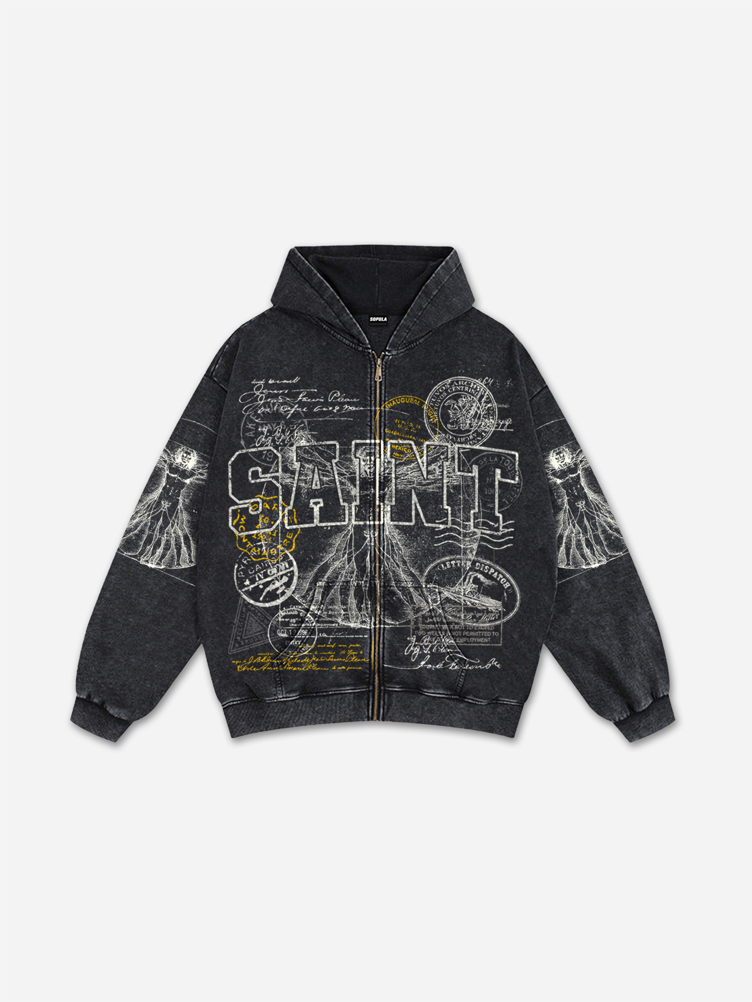 Hellxcity Saints Vitruvian Man Graphic Acid Washed Oversized Zip-up Hoodie