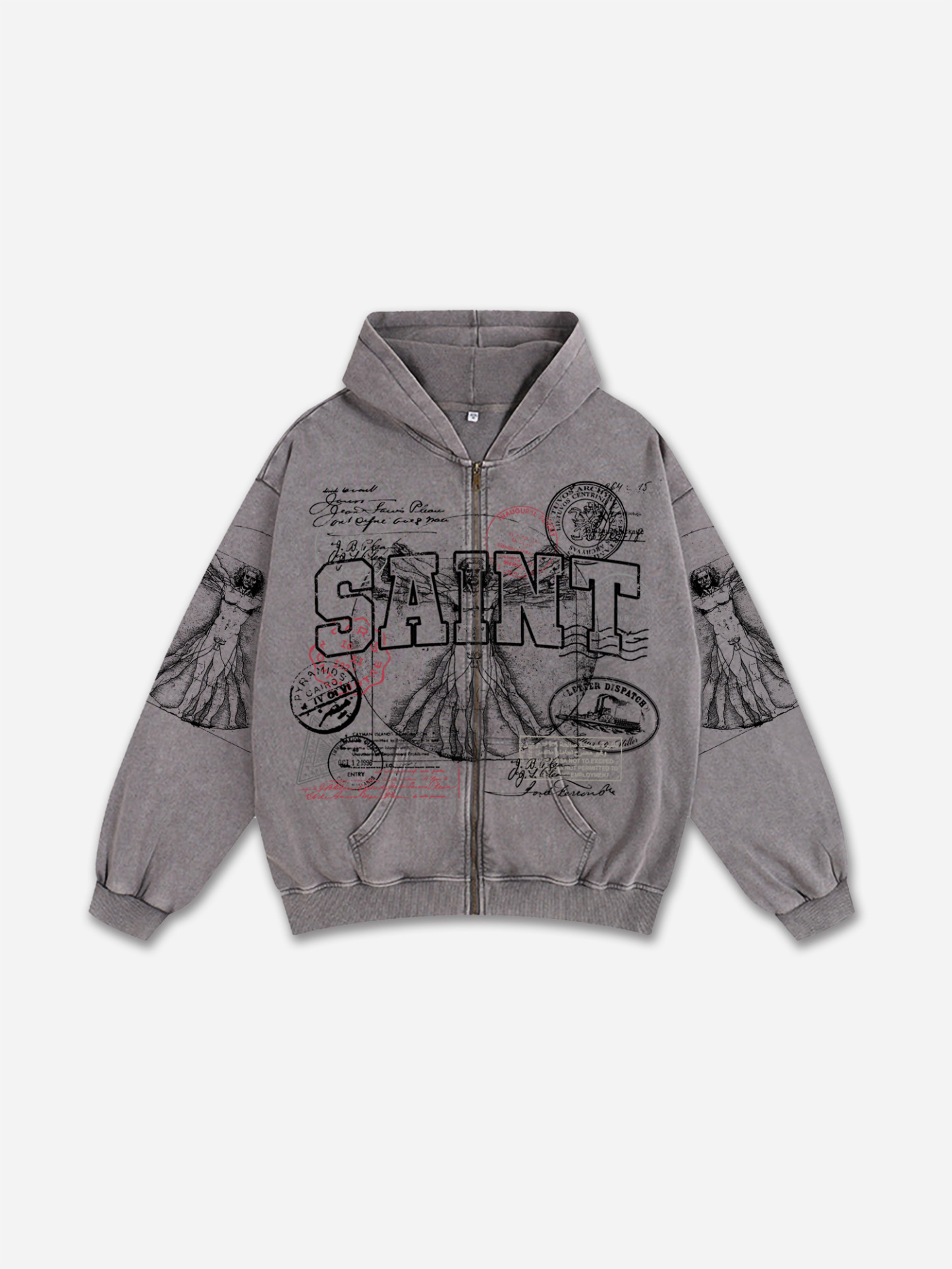 Hellxcity Saints Vitruvian Man Graphic Acid Washed Oversized Zip-up Hoodie